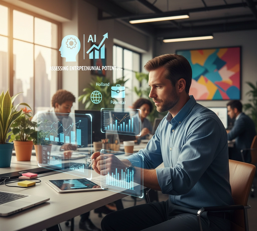 مدل Holland شش تیپ علاقه/محیط را معرفی میکند: Realistic, Investigative, Artistic, Social, Enterprising, Conventional. برای ارزیابی پتانسیل کارآفرینی، بعد E — Enterprising مهمترین پیشبینیکننده اولیه است، اما ترکیب آن با O (Openness) و C (Conscientiousness) در مدلهای شخصیتی (یا شاخصهای مشابه) نشان میدهد که آیا فرد توان تبدیل ایده به محصول را دارد یا فقط به ایدهپردازی علاقهمند است.